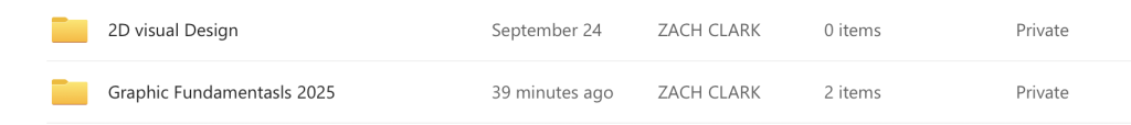 For this session I worked on My double page spread and the work around it I made files to organize all my work one file named “Graphic Design Fundamentals 2025” with fOUR files inside. One for links with a word document containing the links for all of my resources including photos and fonts. A second for the resources in the work I have been doing. A third with the Exports of All My files. Finally a folder with all my working Files.