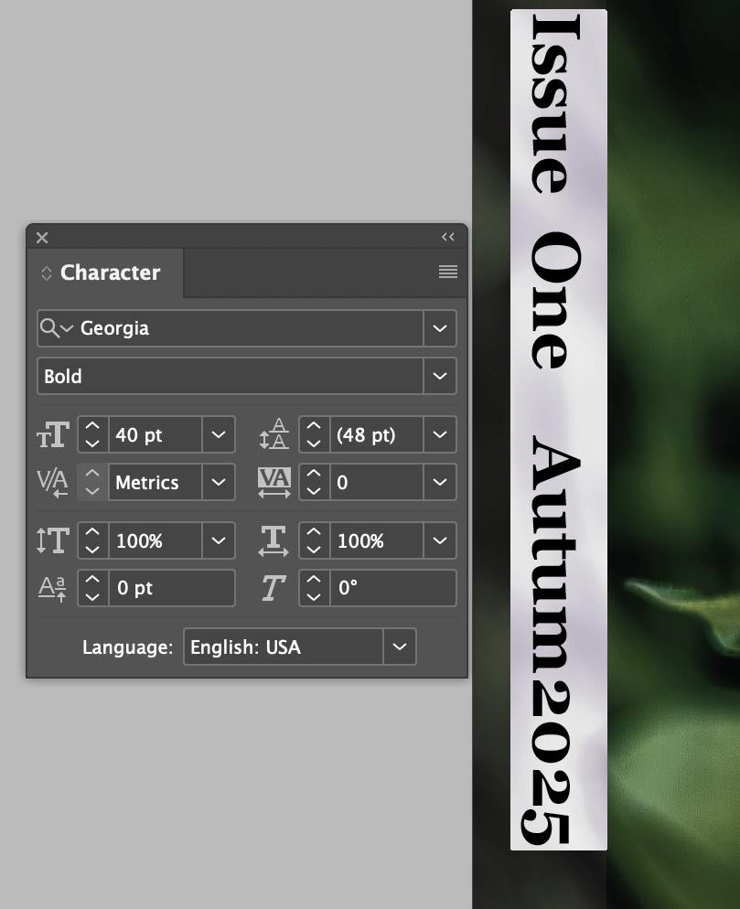 Finally when making this Cover I chose to have a simple design with the Logo curving around the center piece of the photo being the flower, I wanted to do this because it starts having the eye be attracted to the center. The words in the center I wanted to experiment with changing the tracking to make it spread round more of the curve and I then I had the Issue and realase date be in the center in the Georgia font to have it match with the rest of the article text. After doing this to make the first version of the cover I had decided to have the run through logo for the covers so I changed around the composition of the features having the logo take the place of the Issue number and the date. I think this works better as the curve affect takes more room making the full circle effect of nature feel incorporated in the design.