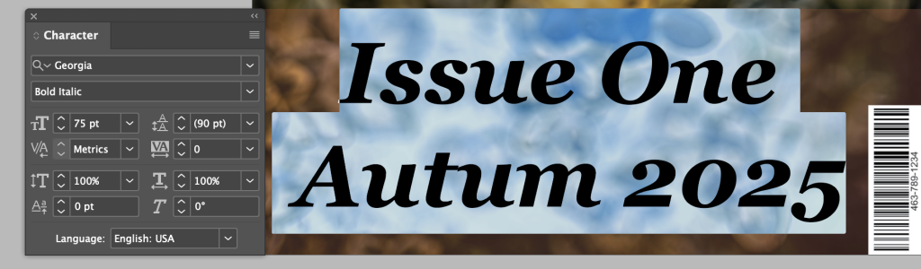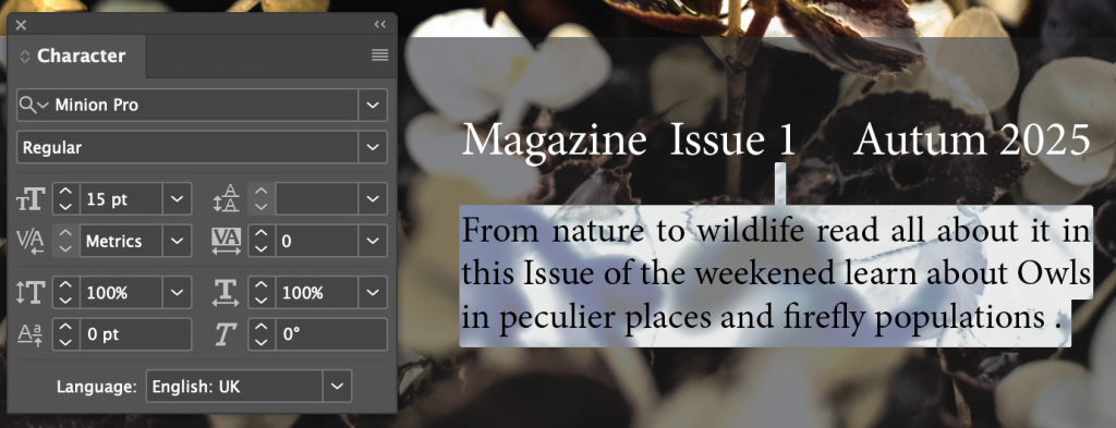 When creating this piece I wanted to experiment with a few things first off I wanted to have the text for the issue and the release date going down the page on a 90 degree angle that is because I didn’t want the entire piece to be with horizontal text I thought that have the L track to follow for the text was a nice touch to change up from other covers i have created. I Chose a gradient for the block background of the title as I wanted to have a gradient made from Colours within the photo. The photo is a photo I took but I chose to have it to fit the nature theme the three articles follow. Finally for the changes to the final design I decided to have the color be solid picked from the flower to link the two and make the cover more uniform and appealing to the eye keeping a minimalist style. Final step adding the minimalist logo to connect to the other covers.